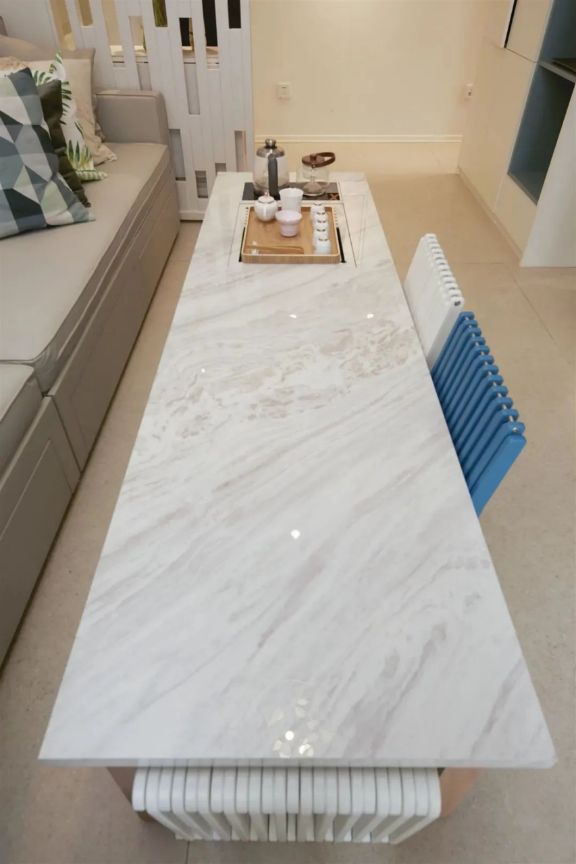 ??設(shè)計(jì)師秦岳明及團(tuán)隊(duì)充分了解房屋結(jié)構(gòu)后,立即討論設(shè)計(jì)出改造方案。在來(lái)到馬可波羅瓷磚門店參觀產(chǎn)品和樣板間后,秦老師決定采用馬可波羅巖板為榜樣人物打造溫暖親切的生活空間。 ??榜樣人物本就有喝茶的習(xí)慣,設(shè)計(jì)師選用防刮耐磨、防污易清潔、耐酸堿腐蝕的馬可波羅巖板白金沙定制巖板茶桌,更讓王蘭蘭日常招待來(lái)客或是用餐打掃輕松省心。 ??此外,裝修客餐廳、臥室和衛(wèi)生間還分別采用了馬可波羅巖板極巖杏、意大利石松和大板莫蘭迪。柔和的色調(diào)搭配、舒適溫馨的空間氛圍獲得了榜樣人物的滿意和認(rèn)可。 ??改造后