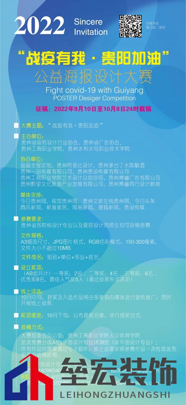 戰(zhàn)疫有我、貴陽(yáng)加油 (可圍繞貴陽(yáng)抗疫自擬主題) 03 組織機(jī)構(gòu) 主辦單位 貴州省裝飾設(shè)計(jì)行業(yè)協(xié)會(huì) 貴州省廣告協(xié)會(huì) 貴州工商職業(yè)學(xué)院 貴州水利水電職業(yè)技術(shù)學(xué)院 協(xié)辦單位 晶晶全屋定制 貴州阿多比設(shè)計(jì) 貴州貴設(shè)傳媒有限公司 貴州一品傳媒有限公司 貴州茅臺(tái)丁水陳釀酒 貴州工商職業(yè)學(xué)院藝術(shù)設(shè)計(jì)眾創(chuàng)空間 貴州黔里文化旅游產(chǎn)業(yè)發(fā)展有限公司 貴州博睿同行設(shè)計(jì)教育 貴州博睿廣告有限公司 04 媒體支持 今日貴州網(wǎng) 視覺(jué)貴州網(wǎng) 貴州文旅在線貴州網(wǎng) 今日頭條 騰訊新聞 新浪家居 網(wǎng)易新聞 搜狐新聞 貴設(shè)傳媒 05 參賽對(duì)象 貴州省各院校設(shè)計(jì)專業(yè)以及愛(ài)好設(shè)計(jì)的師生均可投稿參賽。 06 參賽要求 (一)參賽作品可以繪畫(huà)、插畫(huà)設(shè)計(jì)、廣告設(shè)計(jì)等方式呈現(xiàn)。力求主題鮮明,感染力強(qiáng),有利于擴(kuò)大疫情宣傳的力度,增加群眾自我防護(hù)意識(shí),提升社會(huì)對(duì)戰(zhàn)勝疫情的信心,推動(dòng)全國(guó)疫情防控工作。(二)設(shè)計(jì)關(guān)鍵詞:貴陽(yáng)加油、萬(wàn)眾一心、眾志成城、責(zé)任、生命、使命、愛(ài)心、決心、信心……(三)作品內(nèi)容需要積極向上傳遞正能量,內(nèi)容新穎突出創(chuàng)意、具有較強(qiáng)視覺(jué)沖擊力。(四)參賽作品一律提交電子稿件,文件規(guī)格:JPG圖片格式,RGB色彩模式,精度150-300dpi,每張圖片的尺寸為A3幅面,圖片大小不超過(guò)10MB,圖片文件命名為:組別+單位名稱+專業(yè)+姓名,純手繪作品可掃描后按照上述格式提交電子稿件。(五)每位作者需以Word文檔的形式,填寫(xiě)一份《參賽登記表》,與參賽作品打包提交,表格模板已附在文件最后。 (六)參賽作者需保留參賽作品的位圖原文件或矢量文件,如獲獎(jiǎng)、入選后需提供給主辦單位用于線下展覽及相關(guān)活動(dòng)宣傳。 07 參賽方式 此次競(jìng)賽分成A組(平面設(shè)計(jì)專業(yè))和B組(非平面設(shè)計(jì)專業(yè))。所有作品均需要通過(guò)電子郵件,按上述要求將參賽作品一次性發(fā)送到組委會(huì)收稿郵箱。 A組:平面設(shè)計(jì)專業(yè)組(發(fā)送郵箱:623826969@qq.com); B組:非平面設(shè)計(jì)專業(yè)組(發(fā)送郵箱:530647584@qq.com); 08 大賽進(jìn)程