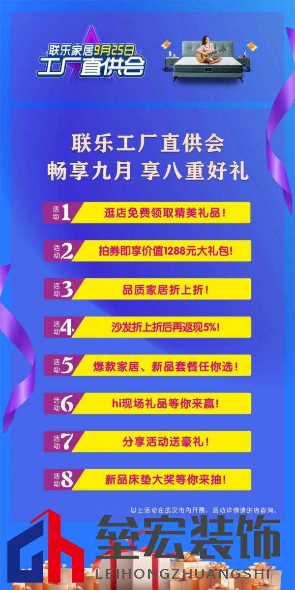 超值家具任意購(gòu) 八重盛惠驚喜連連 2022年9月25日,聯(lián)樂工廠直供節(jié),八重盛“惠”精彩不斷,福利多多。 【樂享禮遇】逛店免費(fèi)領(lǐng)取精美禮品 活動(dòng)期間到武漢市內(nèi)任意一家聯(lián)樂專賣店,可免費(fèi)領(lǐng)取精美地墊一個(gè)。數(shù)量有限,送完即止。 【樂享大禮包】29.9 元拍券即享價(jià)值 1288 元大禮包 凡在聯(lián)樂小程序上以 29.9 元拍到本次活動(dòng)優(yōu)惠券的顧客,即可獲得價(jià)值 1288 元豪華大禮包,包含加厚奶鍋一個(gè)、家居除螨服務(wù)及無門檻現(xiàn)金劵。 【樂享折扣】購(gòu)正價(jià)商品享受折上折 活動(dòng)期間如購(gòu)正價(jià)商品,在正常市場(chǎng)折扣的基礎(chǔ)上再享額外折扣。 【樂享返現(xiàn)】購(gòu)沙發(fā)折后再返現(xiàn) 活動(dòng)期間購(gòu)聯(lián)樂床具商品后再購(gòu)買正價(jià)沙發(fā)商品,則正價(jià)沙發(fā)在享受完折上折之后,可再返現(xiàn)。 【樂享爆款套餐】爆款和套餐限量搶購(gòu) 活動(dòng)期間限量推出多款床具沙發(fā)爆款和套餐,限時(shí)搶購(gòu)。價(jià)格驚艷眼球,搶到就是賺到。 【樂享 hi 現(xiàn)場(chǎng)】hi 現(xiàn)場(chǎng)贏取獎(jiǎng)品 活動(dòng)當(dāng)天開啟多輪 hi 現(xiàn)場(chǎng)游戲互動(dòng),取勝免費(fèi)贏取獎(jiǎng)品,家居用品、電器等享不停。 【樂享分享禮】分享送豪禮 活動(dòng)期間成交的顧客,總繳款額滿一定金額后,分享指定活動(dòng)內(nèi)容至朋友圈或小區(qū)群,憑截圖可獲家電豪禮。 【樂享好運(yùn)氣】抽床墊大獎(jiǎng) 活動(dòng)期間成交的顧客可獲抽獎(jiǎng)券參與抽獎(jiǎng),免費(fèi)床墊大獎(jiǎng)等您抽取。