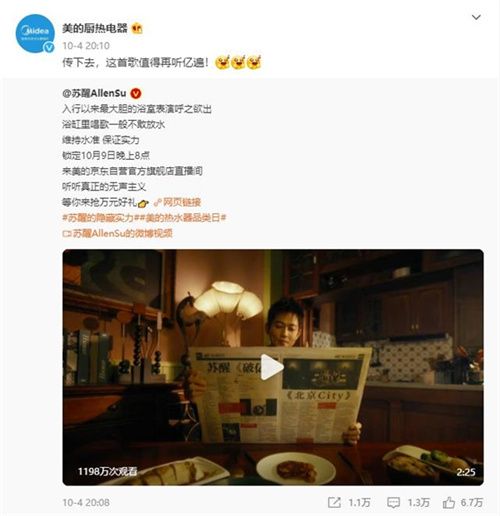 除了話題互動(dòng)外,美的熱水器還攜手明星蘇醒共同演繹《最佳“隱”帝》,通過(guò)說(shuō)唱的方式,再現(xiàn)了用戶生活沐浴中的煩惱,邀請(qǐng)網(wǎng)友一起解鎖萬(wàn)有“隱”力,讓美好蘇醒!