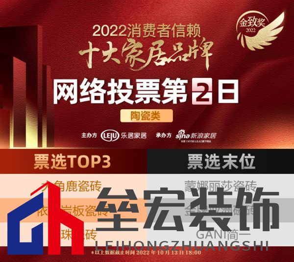 | 由樂居家居主辦,新浪家居承辦;CCTV《大國品牌》、家頁、家居質(zhì)量研究院、大國中居聯(lián)合主辦;全國工商聯(lián)家具裝飾業(yè)商會、中國建筑材料流通協(xié)會共同指導(dǎo);樂騰商學(xué)院、家頁智庫、家居質(zhì)量研究院提供研究支持。9月16日,第三屆《尋找優(yōu)質(zhì)消費者品牌--2022消費者信賴十大家居品牌》正式啟動。經(jīng)過企業(yè)申報、候選品牌公示環(huán)節(jié)后,于10月12日正式進(jìn)入投票環(huán)節(jié)。>>點擊進(jìn)入投票頁 陶瓷品類第二日戰(zhàn)報如下