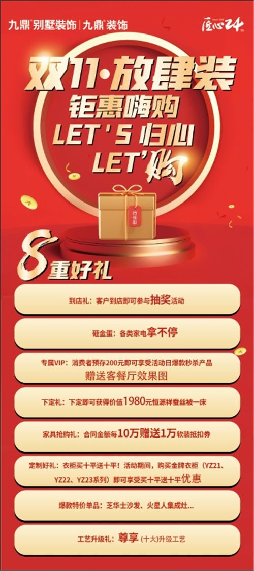 | 前言:安徽蕪湖九鼎裝飾、江蘇連云港九鼎裝飾、河北邯鄲九鼎裝飾、山東青島九鼎裝飾、浙江義烏九鼎裝飾、寧夏銀川九鼎裝飾、山東日照九鼎裝飾......等全國百余家分公司進(jìn)行全國聯(lián)動,迎戰(zhàn)雙十一。 雙十一,某寶、某東、某多......劍拔弩張,大戰(zhàn)一觸即發(fā),打折、讓利、滿減、送券、直減!聰明的你,也似乎快要被滿屏的“便宜”沖昏頭腦.... 九鼎裝飾讓你跳出真香定律,拒絕套路,不用“剁手”,讓新家裝修變得更簡單!雙十一鉅惠力誠秒爆電商,真正雙十一的優(yōu)惠力度,不需要你動腦算了又算,各大家裝品牌直接給你活動價,與其他電商產(chǎn)品對比不在怕!讓裝修人不當(dāng)小韭菜,為您置家之路省省省! “雙11.放肆裝”百城聯(lián)動,千萬補貼, 九鼎裝飾雙11鉅惠活動來啦 11月1日至11月11日 九鼎裝飾百城聯(lián)動各城市公司 備足多重豪禮 整裝特享、家具搶購禮爆款特價單品、定制好禮、工藝升級禮…… 期待各位光臨