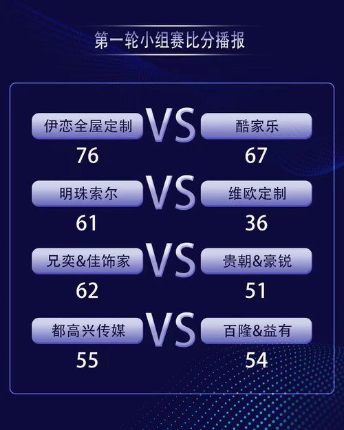 ??在經(jīng)過一番火熱的比拼后,最終伊戀全屋定制76比67戰(zhàn)勝酷家樂,明珠索爾61比36力克維歐定制,兄奕&佳飾家聯(lián)隊(duì)62比51戰(zhàn)勝貴朝&豪銳聯(lián)隊(duì),都高興傳媒55比54險(xiǎn)勝百隆&益有聯(lián)隊(duì),8支參賽隊(duì)伍為現(xiàn)場觀眾帶來了4場精彩絕倫的比賽。