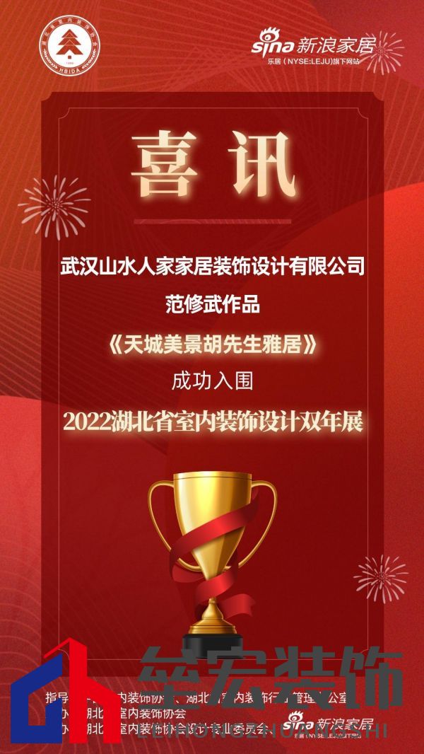 | 綠色設(shè)計,大美荊楚,由中國室內(nèi)裝飾協(xié)會、湖北省室內(nèi)裝飾行業(yè)管理辦公室的指導(dǎo),湖北省室內(nèi)裝飾協(xié)會主辦的2022湖北室內(nèi)裝飾設(shè)計雙年展,在室內(nèi)裝飾設(shè)計行業(yè)打造了一場全省范圍的設(shè)計盛會,首輪評選百余套作品,70余套優(yōu)秀作品成功入圍。 在智能化、人文化、健康舒適化的時代趨勢下,雙年展的舉辦,以新時代、新理念、新創(chuàng)意,提升室內(nèi)裝飾設(shè)計水平,為設(shè)計師進行品牌賦能,弘揚荊楚設(shè)計精神與風貌。針對這項有權(quán)威性、有知名度的專業(yè)賽事,武漢各大裝飾公司及設(shè)計工作室積極響應(yīng),因為參加雙年展對設(shè)計師開拓視野、加強行業(yè)交流、提升專業(yè)水平具有重要意義。 雙年展專家組評委秉承公正公平、優(yōu)中選優(yōu)的原則,經(jīng)過層層篩選,初評結(jié)果現(xiàn)已出爐。 設(shè)計滋養(yǎng)生活,生活反哺設(shè)計,優(yōu)秀的作品,總是離不開對藝術(shù)矢志不移的熱情與探索,以及對美與愛的深度感知,雙年展入圍作品均對此進行了完美的詮釋。 武漢山水人家家居裝飾設(shè)計有限公司設(shè)計師范修武原創(chuàng)作品《天城美景胡先生雅居》,成功入圍2022湖北省室內(nèi)裝飾設(shè)計雙年展,以獨特的設(shè)計風格,和優(yōu)秀的設(shè)計能力,展示設(shè)計理念和創(chuàng)意。