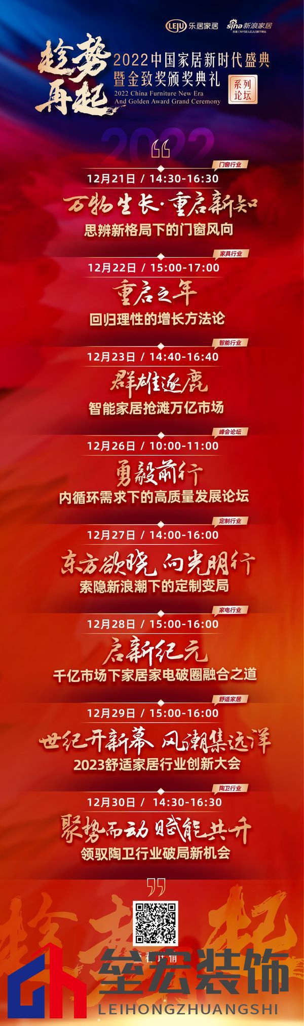 ??“連接美好生活,共創(chuàng)行業(yè)佳績”,家居、家裝行業(yè)未來的高質(zhì)量發(fā)展離不開每個家居優(yōu)秀企業(yè)的聚力,也離不開每一個行業(yè)踐行高質(zhì)量發(fā)展的責(zé)任與決心。歲末年初交替之際,樂居家居與新浪家居將始終不遺余力地深入家居行業(yè)及泛家居領(lǐng)域,發(fā)現(xiàn)、構(gòu)筑、傳遞中國家居企業(yè)示范精神和榜樣力量,匯聚勇于擔(dān)當(dāng)中國民族品牌復(fù)興重任的精英企業(yè)家,展現(xiàn)新時代背景下中國家居品牌特有的氣質(zhì)與力量,為中國自主品牌發(fā)聲,助推中國品牌群體崛起! ??“回眸過往、展望未來”,『2022中國家居新時代盛典』將以“信心、融合、共贏、高質(zhì)量發(fā)展”為關(guān)鍵詞,匯聚行業(yè)領(lǐng)袖及專家學(xué)者,把脈發(fā)展動向,共話大變局下的可持續(xù)發(fā)展之道,以信念加持行動,推動行業(yè)持續(xù)發(fā)展,助力國家經(jīng)濟(jì)有序復(fù)蘇。 ??12月26日,讓我們家居人一到趁勢再起、勇毅前行,昂首闊步開啟家居產(chǎn)業(yè)高質(zhì)量發(fā)展新紀(jì)元。 |
