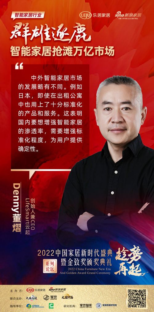 | 新浪家居智能家居頻道獨(dú)家報(bào)道 2022年12月23日,新浪家居舉辦“趁勢(shì)?再起——2022中國(guó)家居新時(shí)代盛典暨金致獎(jiǎng)?lì)C獎(jiǎng)典禮”系列論壇,其中智能家居行業(yè)特別舉辦“群雄逐鹿——智能家居搶灘萬億市場(chǎng)”線上分論壇。KNX協(xié)會(huì)中國(guó)區(qū)代表何檢、LifeSmart云起創(chuàng)始人兼CEO Denny董熠、摩根全屋智能戰(zhàn)略事業(yè)部總經(jīng)理胡先華、盈趣智能副總經(jīng)理林軍等幾位行業(yè)參與者一起論道智能家居,描繪行業(yè)未來發(fā)展圖譜。 LifeSmart云起創(chuàng)始人兼CEO Denny董熠表示,中外智能家居市場(chǎng)的發(fā)展略有不同。例如日本,即使在出租公寓中也用上了十分標(biāo)準(zhǔn)化的產(chǎn)品和服務(wù)。這表明國(guó)內(nèi)要想增強(qiáng)智能家居的滲透率,需要增強(qiáng)標(biāo)準(zhǔn)化程度,為用戶提供確定性。