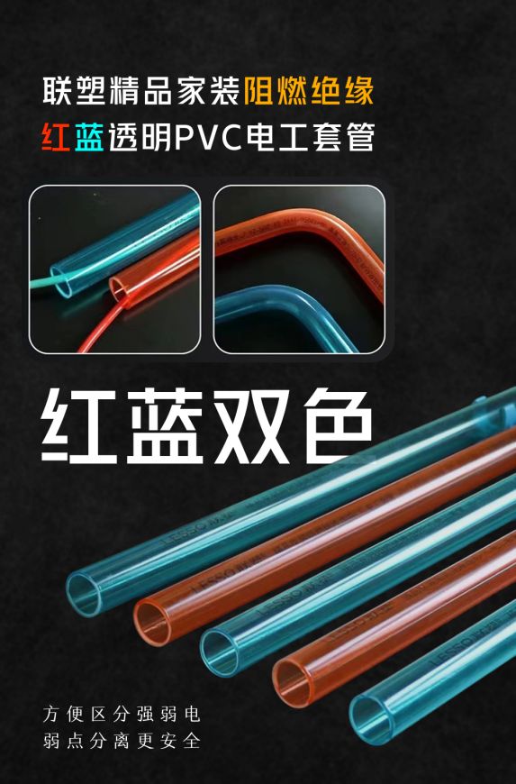 ??下水口搭配安裝聯(lián)塑防返溢地漏系列產(chǎn)品 ??還能更好地解決“臭、堵、淹、溢”等問題 ??3、電路保護 ??電路鋪設(shè)同樣是家裝的重中之重 ??隱藏在墻體或地板內(nèi)的電路 ??一旦發(fā)生短路、漏電等問題 ??不僅影響正常使用,還容易引發(fā)火災(zāi) ??所以電路的保護也一定不能馬虎 ??聯(lián)塑精品家裝阻燃絕緣紅藍透明PVC電工套管 ??采用新型PVC材質(zhì) ??透明度高,彎曲性能好 ??可為電路提供多一層可靠保護 ??紅藍雙色設(shè)計,更便于區(qū)分強弱電 ??及時檢查、排除安全隱患