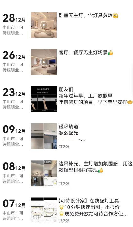 ??三、內(nèi)容賦能 ??新媒體共享內(nèi)容素材 ??KESHI可詩照明在小紅書、抖音、嗶哩嗶哩、快手等新媒體渠道強(qiáng)勢布局,累計(jì)吸粉超100W+。無論是官方號(hào)還是燈光設(shè)計(jì)師矩陣號(hào),都持續(xù)產(chǎn)出能促進(jìn)產(chǎn)品轉(zhuǎn)化的爆文、精品文,內(nèi)容素材涵蓋圖片、視頻、文章等多種形式。KESHI可詩照明與合作伙伴共享新媒體內(nèi)容素材,愿助力合作方有方向性地實(shí)現(xiàn)高質(zhì)量的朋友圈內(nèi)容營銷。