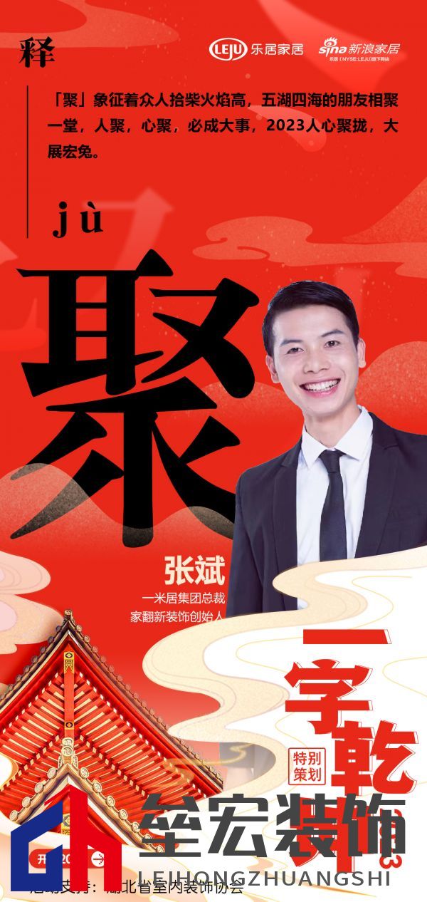 在新浪家居“2023一字乾坤”活動(dòng)中,一米居集團(tuán)總裁、家翻新裝飾創(chuàng)始人張斌:「聚」象征著眾人拾柴火焰高,五湖四海的朋友相聚一堂,人聚,心聚,必成大事,2023人心聚攏,大展宏兔。 “以漢字賦能湖北家居企業(yè),彰顯厚積薄發(fā)之力”,以單字抒寫了各家企業(yè)及媒體的新年愿景與發(fā)展信條,領(lǐng)略楚風(fēng)漢韻下湖北家居人砥礪向前,揚(yáng)帆未來的決心與動(dòng)力,情暖兔歲,新啟華章。 |