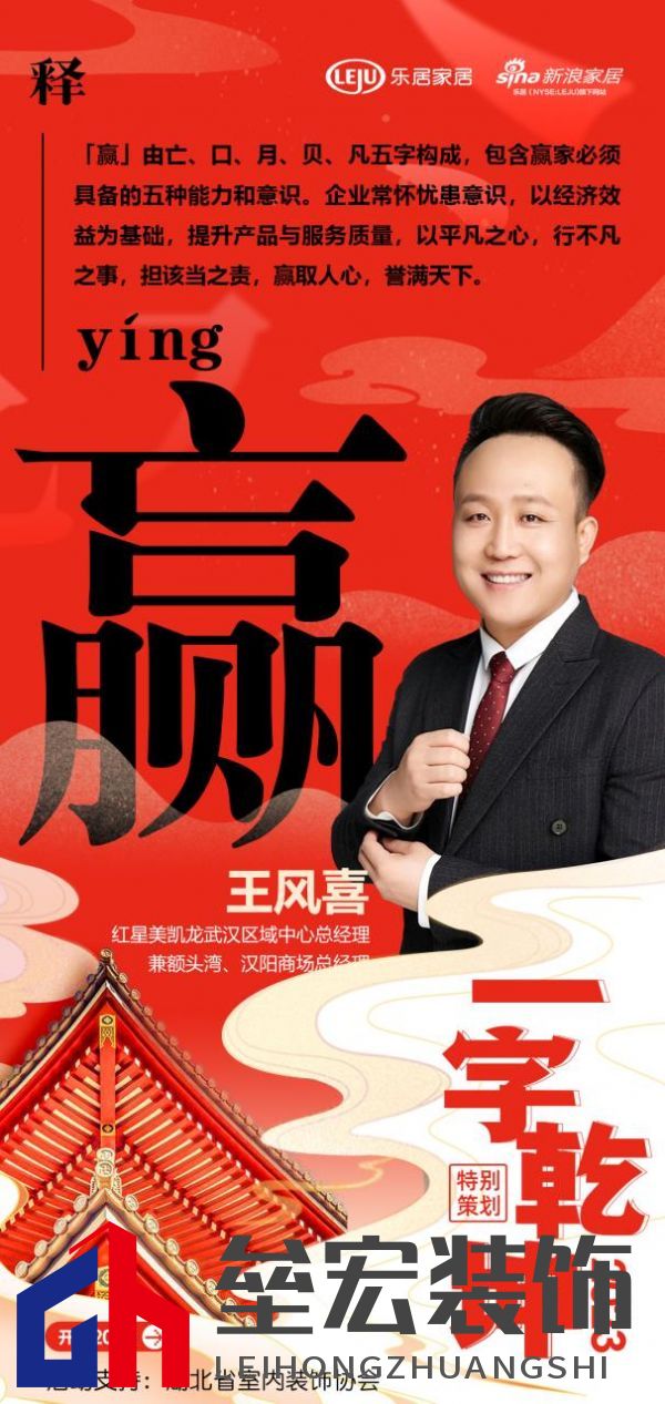 在新浪家居“2023一字乾坤”活動(dòng)中,紅星美凱龍武漢區(qū)域中心總經(jīng)理兼額頭灣、漢陽(yáng)商場(chǎng)總經(jīng)理王風(fēng)喜:「贏」由亡、口、月、貝、凡五字構(gòu)成,包含贏家必須具備的五種能力和意識(shí)。企業(yè)常懷憂患意識(shí),以經(jīng)濟(jì)效益為基礎(chǔ),提升產(chǎn)品與服務(wù)質(zhì)量,以平凡之心,行不凡之事,擔(dān)該當(dāng)之責(zé),贏取人心,譽(yù)滿天下。 “以漢字賦能湖北家居企業(yè),彰顯厚積薄發(fā)之力”,以單字抒寫了各家企業(yè)及媒體的新年愿景與發(fā)展信條,領(lǐng)略楚風(fēng)漢韻下湖北家居人砥礪向前,揚(yáng)帆未來(lái)的決心與動(dòng)力,情暖兔歲,新啟華章。 |