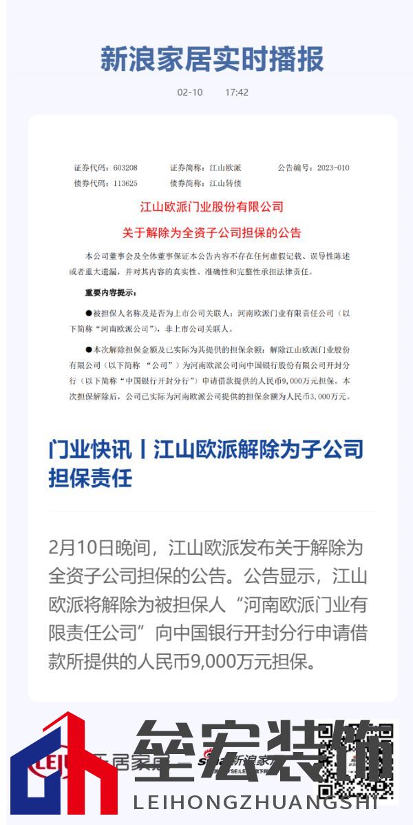 ??2月10日晚間,江山歐派發(fā)布關于解除為全資子公司擔保的公告。公告顯示,江山歐派將解除為被擔保人“河南歐派門業(yè)有限責任公司”向中國銀行開封分行申請借款所提供的人民幣9,000萬元擔保。