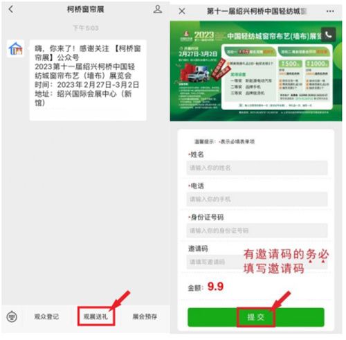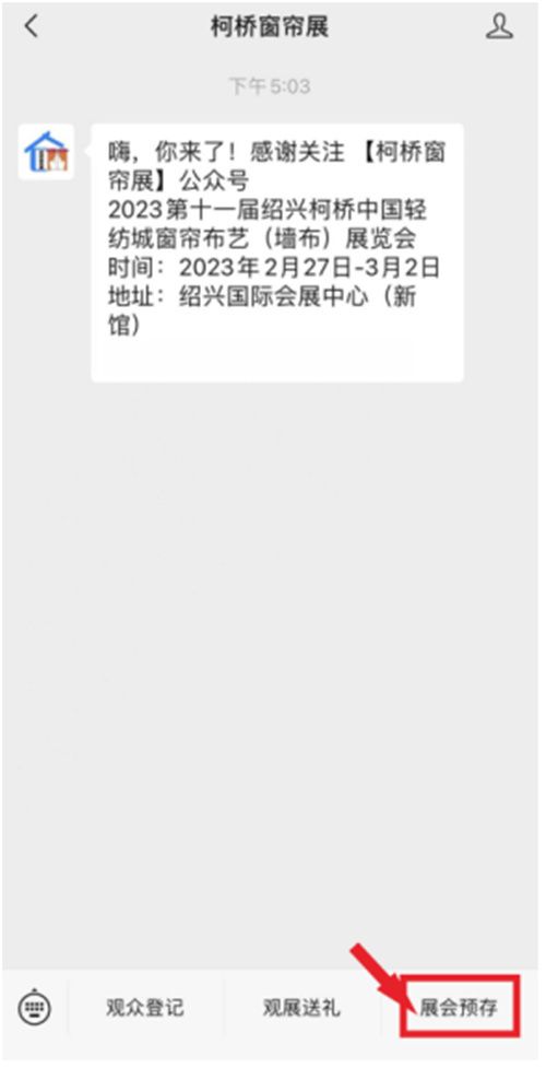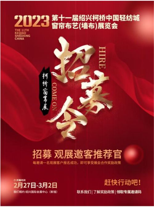 1、微信搜索“柯橋窗簾展”公眾號,進入公眾號首頁 2、點擊下方“展會預(yù)存” 展會活動三: 展會邀客推薦官 邀請周邊小伙伴共同參與 做觀展邀客推薦官 關(guān)注“柯橋窗簾展”公眾號了解詳情