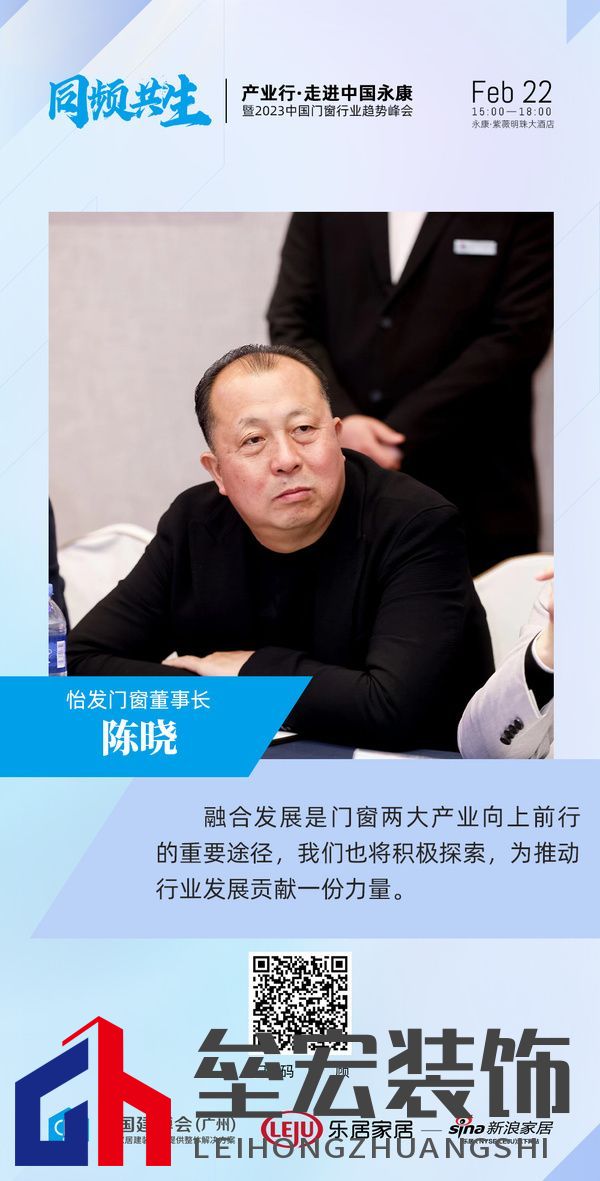 ??怡發(fā)門窗董事長(zhǎng)陳曉:融合發(fā)展是門窗兩大產(chǎn)業(yè)向上前行的重要途徑,我們也將積極探索,為推動(dòng)行業(yè)發(fā)展貢獻(xiàn)一份力量。 |