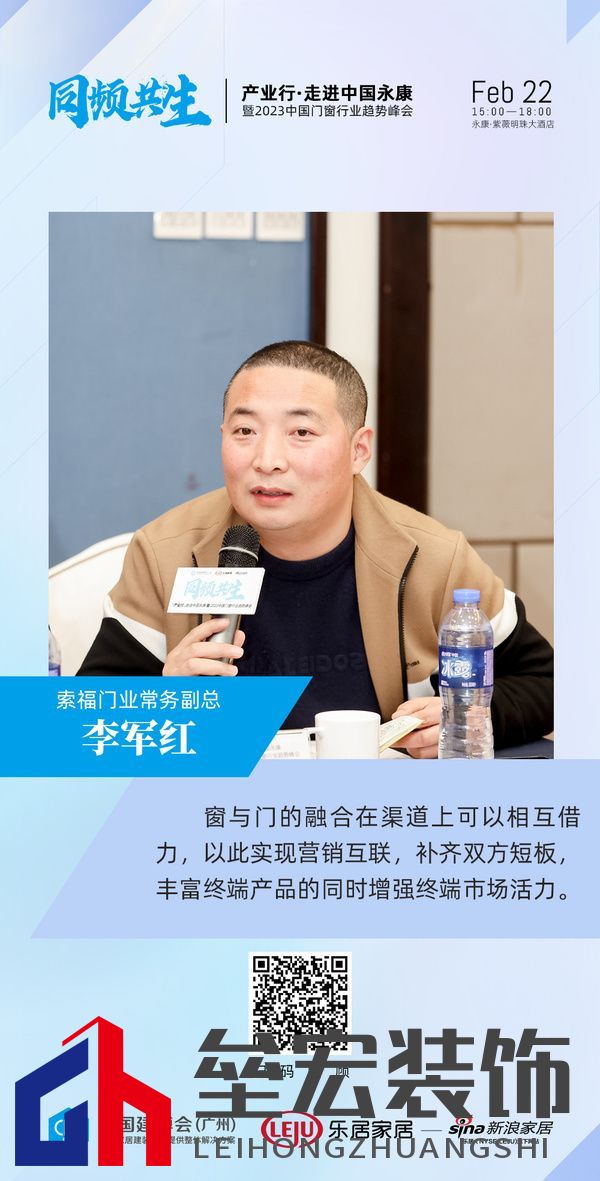 ??索福門業(yè)常務(wù)副總李軍紅:窗與門的融合在渠道上可以相互借力,以此實(shí)現(xiàn)營(yíng)銷互聯(lián),補(bǔ)齊雙方短板,豐富終端產(chǎn)品的同時(shí)增強(qiáng)終端市場(chǎng)活力。 |