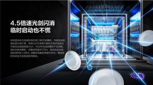 ??在最新推出的光劍消毒柜XS827上搭載了光動(dòng)力低溫快消科技,機(jī)身頂部和背部搭載雙渦旋速烘技術(shù),配合電熱加熱管,輸出中低溫環(huán)繞式循環(huán)熱風(fēng),平均烘干溫度只有50℃,這使得寶貝的奶瓶、牙膠等等這些重要的小物件都不會(huì)被高溫灼傷,從此可以放心消毒了。且消毒烘干全流程只需40分鐘,遠(yuǎn)低于120-180分鐘的高溫消毒和90-150分鐘的臭氧+紫外線(xiàn)消毒,這使得大多數(shù)家庭在烹飪前臨時(shí)啟動(dòng)消毒柜,也不會(huì)耽誤享用美食。