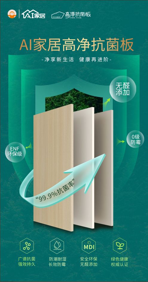??AI家居高凈抗菌板,作為集“無醛添加、抗菌、防霉”三重守護(hù)力于一體的環(huán)保板材,是品牌為廣大消費(fèi)者打造健康整家新防線,積極推進(jìn)國(guó)家兒童友好空間體系建設(shè)的拳頭產(chǎn)品。從原材料的選取、基材成型,到裁板切割、封邊貼面,生產(chǎn)過程不添加甲醛物質(zhì),真正實(shí)現(xiàn)無甲醛添加。