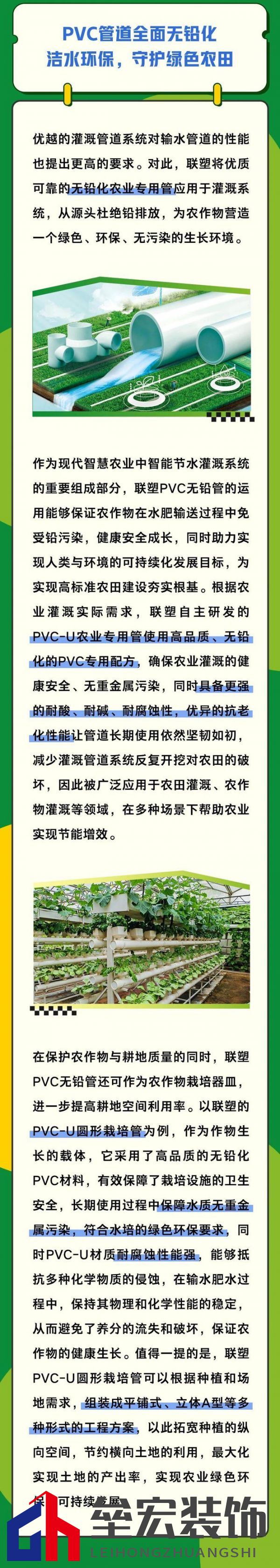 憑借在節(jié)水灌溉領(lǐng)域的深度耕耘,聯(lián)塑獲得了“灌溉強(qiáng)農(nóng)卓越品牌”獎(jiǎng)項(xiàng)。未來,聯(lián)塑將持續(xù)深耕智能節(jié)水灌溉領(lǐng)域,通過不斷的技術(shù)創(chuàng)新和服務(wù)升級(jí)為農(nóng)業(yè)綠色、可持續(xù)發(fā)展貢獻(xiàn)自己的力量。 潔水環(huán)保,守護(hù)綠色農(nóng)田 優(yōu)越的灌溉管道系統(tǒng)對(duì)輸水管道的性能也提出更高的要求。對(duì)此,聯(lián)塑將優(yōu)質(zhì)可靠的無鉛化農(nóng)業(yè)專用管應(yīng)用于灌溉系統(tǒng),從源頭杜絕鉛排放,為農(nóng)作物營(yíng)造一個(gè)綠色、環(huán)保、無污染的生長(zhǎng)環(huán)境。 作為現(xiàn)代智慧農(nóng)業(yè)中智能節(jié)水灌溉系統(tǒng)的重要組成部分,聯(lián)塑PVC無鉛管的運(yùn)用能夠保證農(nóng)作物在水肥輸送過程中免受鉛污染,健康安全成長(zhǎng),同時(shí)助力實(shí)現(xiàn)人類與環(huán)境的可持續(xù)化發(fā)展目標(biāo),為實(shí)現(xiàn)高標(biāo)準(zhǔn)農(nóng)田建設(shè)夯實(shí)根基。根據(jù)農(nóng)業(yè)灌溉實(shí)際需求,聯(lián)塑自主研發(fā)的PVC-U農(nóng)業(yè)專用管使用高品質(zhì)、無鉛化的PVC專用配方,確保農(nóng)業(yè)灌溉的健康安全、無重金屬污染,同時(shí)具備更強(qiáng)的耐酸、耐堿、耐腐蝕性,優(yōu)異的抗老化性能讓管道長(zhǎng)期使用依然堅(jiān)韌如初減少灌溉管道系統(tǒng)反復(fù)開挖對(duì)農(nóng)田的破壞,因此被廣泛應(yīng)用于農(nóng)田灌溉、農(nóng)作物灌溉等領(lǐng)域,在多種場(chǎng)景下幫助農(nóng)業(yè)實(shí)現(xiàn)節(jié)能增效。
