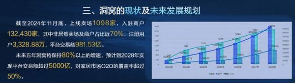 (三)產業(yè)賦能 數(shù)智升級 線上線下的產業(yè)融合,是多數(shù)企業(yè)數(shù)智化改造的重點。面對需求洞窩產業(yè)服務平臺應運而生,以其獨特的定位和創(chuàng)新的服務模式,為家居產業(yè)帶來了數(shù)智升級的新機遇。 洞窩平臺致力于為商戶和賣場打造線上線下完全融合的數(shù)字化營銷系統(tǒng)(DMS),實現(xiàn)線上線下的無縫對接,有效整合流量資源,提升營銷效果;以及全渠道商業(yè)管理系統(tǒng)(DOS),助力商戶和賣場實現(xiàn)精細化運營,提高整體運營效率。更為值得一提的是,洞窩平臺還積極賦能產業(yè)出海和跨境電商,為家居產業(yè)的國際化發(fā)展提供了有力支持。