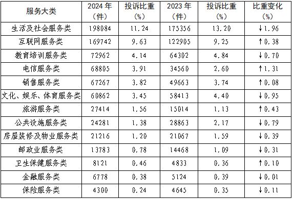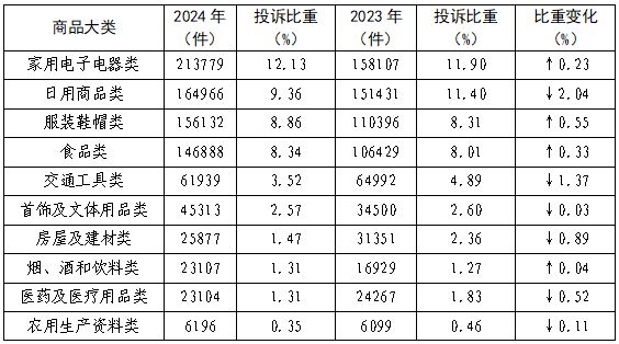 | 2月6日,中國(guó)消費(fèi)者協(xié)會(huì)發(fā)布2024年全國(guó)消協(xié)組織受理投訴情況統(tǒng)計(jì)結(jié)果。 2024年全國(guó)消協(xié)組織共受理消費(fèi)者投訴1761886件,比上年增長(zhǎng)32.62%,解決1211284件,投訴解決率68.75%,為消費(fèi)者挽回經(jīng)濟(jì)損失12.8億元。 商品大類(lèi)方面,家用電子電器類(lèi)、房屋及建材類(lèi)投訴量居前十位。其中,家用電子電器類(lèi)投訴量高達(dá)213779件,為投訴量最多的商品,投訴比重為12.13%, 同比投訴比重上升0.23個(gè)百分點(diǎn)。另外,房屋及建材類(lèi)2024年投訴量25877件,占投訴比重1.47%,相較2023年下降0.89個(gè)百分點(diǎn),投訴量排名第七。 商品大類(lèi)投訴量圖(單位:件) 商品大類(lèi)投訴量變化表 根據(jù)服務(wù)大類(lèi)投訴數(shù)據(jù)顯示,房屋裝修及物業(yè)服務(wù)投訴量居第九位,為21216件,投訴比重為1.20%,同比投訴比重下降0.39%。 服務(wù)大類(lèi)投訴量圖(單位:件) 服務(wù)大類(lèi)投訴量變化表 在具體商品投訴中,家具類(lèi)2024年投訴量為33822件,相較2023年上升20.95%,位居商品細(xì)分領(lǐng)域投訴排名的第七位。 商品細(xì)分領(lǐng)域投訴前十位(單位:件) 投訴量居前十位的商品(單位:件)