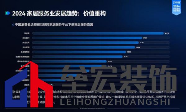 報告顯示,效率高、先行賠付、安全性高、專業(yè)性強是中國消費者選擇線上下單家居服務(wù)的主要原因。而用戶評價及品牌口碑是用戶選擇平臺的重要決策要素,其次是服務(wù)覆蓋率和服務(wù)價格。