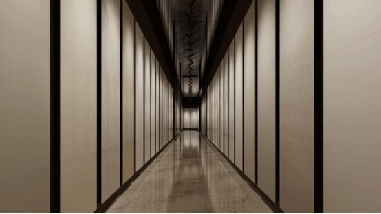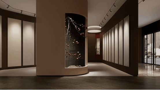 弧形選材區(qū)以立柱為中心,采用發(fā)散式弧形布局打破傳統(tǒng)展示邊界。鏡面天花與流暢的展線設(shè)計(jì)形成視覺延伸,讓空間在虛實(shí)交錯(cuò)中倍增開闊感。