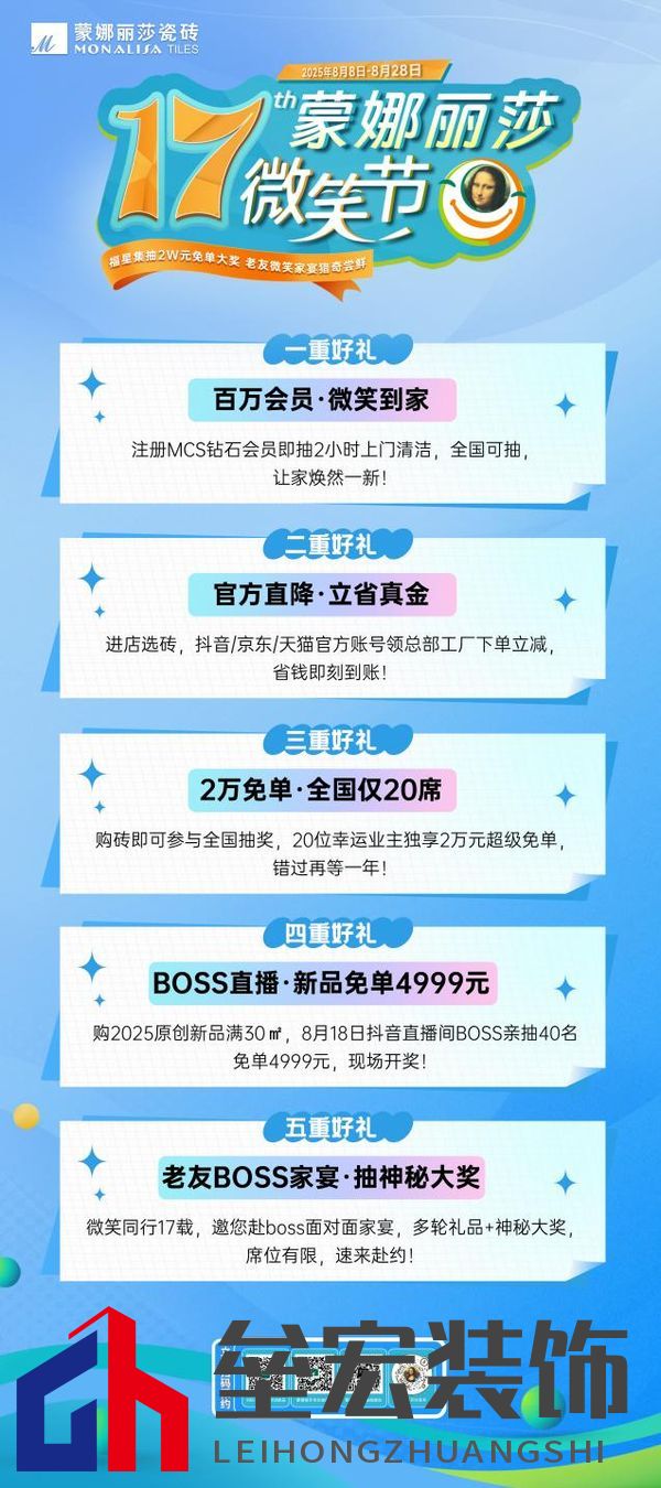 ??為真誠(chéng)回饋廣大用戶的信賴,今年針對(duì)2025原創(chuàng)新品——「時(shí)空石韻」與「無(wú)極石界」的優(yōu)惠力度進(jìn)行了重磅升級(jí),凡用戶購(gòu)買(mǎi)上述新品對(duì)應(yīng)規(guī)格瓷磚面積達(dá)30㎡及以上,即可有機(jī)會(huì)抽取4999元免單大獎(jiǎng),鎖定8月18日,蒙娜麗莎瓷磚抖音官方直播間將迎來(lái)神秘BOSS空降,這場(chǎng)專屬直播將會(huì)揭曉免單名額! 微笑力量,從品質(zhì)交付到情感聯(lián)結(jié)??承載著對(duì)”美好家“與健康生活的執(zhí)著追求,更為了回饋萬(wàn)千用戶的信任與期待,蒙娜麗莎微笑節(jié)已在全國(guó)范圍200多個(gè)城市,超3000家線下門(mén)店展開(kāi),同步打通天貓、京東、抖音直播間等線上渠道,形成了全覆蓋渠道的系列主題活動(dòng)。 ??今年8月8日,這場(chǎng)持續(xù)的溫暖承諾將再度兌現(xiàn)。第十七屆蒙娜麗莎微笑節(jié)即將盛大啟幕,其中,最令人期待的”BOSS微笑家宴“,是品牌誠(chéng)意與溫度的集中體現(xiàn),用戶將獲得與老板面對(duì)面交流的機(jī)會(huì),暢談使用蒙娜麗莎瓷磚的真實(shí)體驗(yàn)與生活故事。?現(xiàn)場(chǎng)還將精心準(zhǔn)備多輪禮品福利,更有機(jī)會(huì)抽取驚喜大獎(jiǎng),這不僅是一場(chǎng)傾聽(tīng)用戶心聲的對(duì)話,更是一次拉近品牌與用戶距離的情感交融。