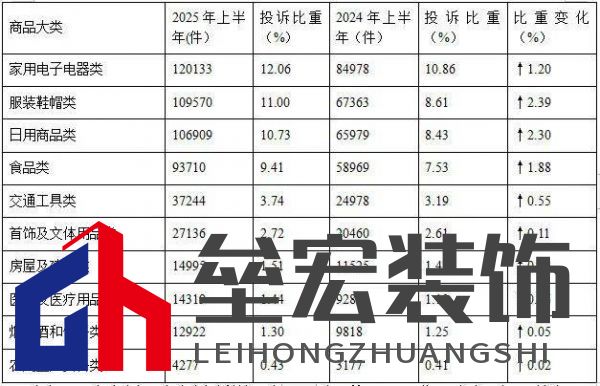 | 8月6日,中國消費者協(xié)會發(fā)布“2025年上半年全國消協(xié)組織受理投訴分類基本情況”。 商品大類投訴數(shù)據(jù) 根據(jù)各商品大類投訴數(shù)據(jù),家用電子電器類、房屋及建材類投訴量均進入所屬投訴類別的前十位。其中,家用電子電器類投訴量居首位,達120133件,投訴比重為12.06%,與2024年同期相比投訴比重上升1.2%。房屋及建材類投訴量居第七位,為14995件,投訴比重為1.51%,與2024年同期相比上升0.04%。 服務大類投訴數(shù)據(jù) 根據(jù)2025年上半年服務大類投訴數(shù)據(jù),房屋裝修及物業(yè)服務投訴量居第九位,為10042件,投訴比重為1.01%,與2024年上半年相比投訴比下降0.32%。 具體商品投訴 在具體商品投訴中,家具投訴量為19760件,與2024年同期相比上升36.79%。 |