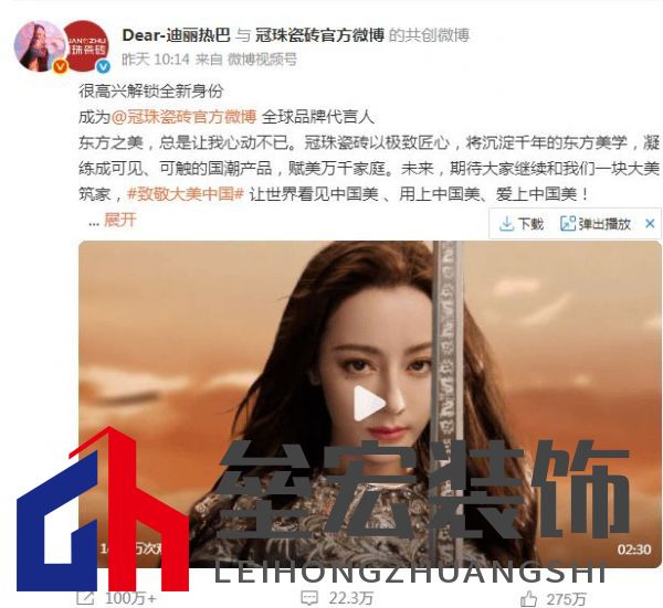 | 東方有大美而不言,棲居之道,自成方圓! 2025年7月30日,冠珠瓷磚攜手全球品牌代言人迪麗熱巴開(kāi)啟筑家美學(xué)新章,2025品牌宣傳片全新上映,致力以一場(chǎng)穿越時(shí)空的美學(xué)對(duì)話,深耕中國(guó)美的深度,探索世界美的高度,以迭代的中國(guó)美豐盈筑家美學(xué),與全球消費(fèi)者共鳴、共享、共進(jìn)!品牌宣傳片上映一天就獲得千萬(wàn)播放,熱度持續(xù)上漲!