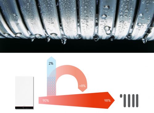 ??初代冷凝爐——冷凝技術 ??「冷凝」技術可以理解為一種“熱量回收”技術,它能夠將高溫煙氣中的熱量進行充分回收利用。 ??比如燒燃天然氣時,高溫煙氣原本會帶著大量熱量直接排走,但冷凝技術會把這些高溫煙氣強行“降溫”,讓其中的水蒸氣像出汗一樣變成液態(tài)水,同時釋放出大量隱藏的熱量,這些“搶回來”的熱量又被重新利用。運用這個原理,冷凝壁掛爐就能把排放煙氣中的熱量充分回收再用于供熱。