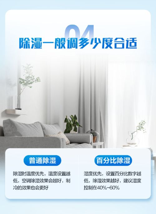 ??四、除濕一般調(diào)多少度合適 ??普通除濕:除濕時溫度優(yōu)先,溫度設(shè)置越低,空調(diào)除濕效果會越好,制冷的效果也會更好。 ??百分比除濕:濕度優(yōu)先,設(shè)置百分比數(shù)字越低,除濕效果越好,建議濕度控制在40%~60%。