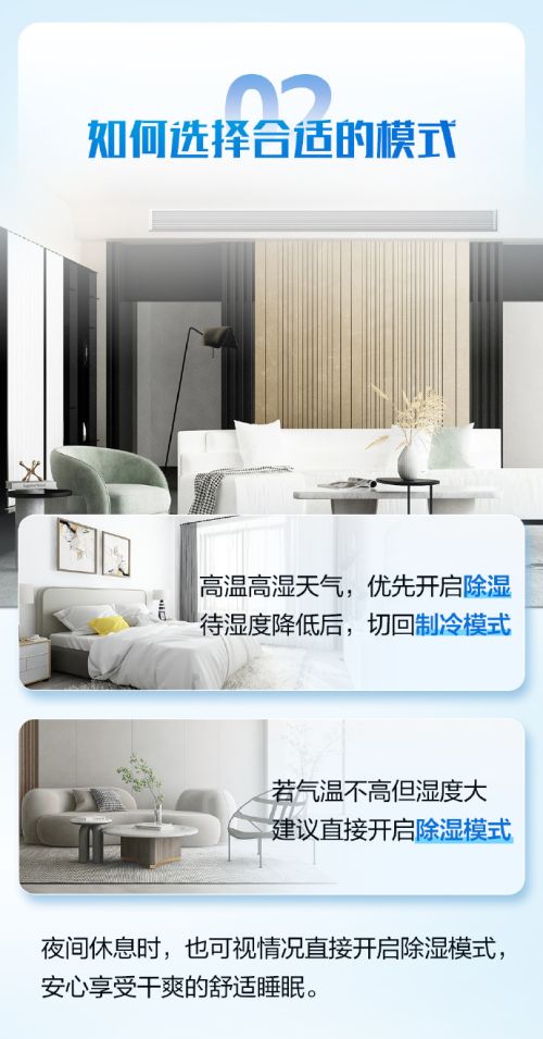 ??二、如何選擇合適的模式 ??高溫高濕天氣,優(yōu)先開啟除濕 ??待濕度降低后,切回制冷模式 ??若氣溫不高但濕度大,建議直接開啟除濕模式。 ??夜間休息時,也可視情況直接開啟除濕模式安心享受干爽的舒適睡眠。