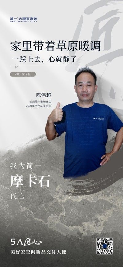 (摩卡石細(xì)啞面表面效果) ??陳偉超的二十五年,恰似他摯愛的摩卡石——不喧嘩,自有聲。他俯身校準(zhǔn)每道切割線的專注,如同磚面上凝固的沙痕,于靜默中鋪就天地的遼闊;他讓磚縫消隱的執(zhí)念,恰似這細(xì)啞工藝的溫潤,用精工托起生活的本真。在5A空間交付的敘事里,他是讓自然住進(jìn)方寸的詩人:用磚石編織草原,用縫隙丈量心安。 ??這僅是簡一5A匠心?美好家空間新品交付大使故事的又一篇章。后續(xù)將有更多匠人帶著他們守護(hù)的簡一新品走來——或許是另一種地貌的呼吸,或許是另一段光陰的凝練。不妨靜候:那些藏在磚石肌理里的天地大美,將如何重塑“家”的想象邊界。 |