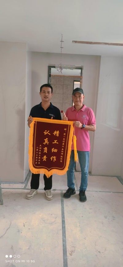 ??盛夏的工地沒有空調(diào),汗水順著額角淌進(jìn)眼睛里,他抹把臉繼續(xù)校準(zhǔn)瓷磚,手指不停在磚邊比畫,就怕一刀下去破壞了紋路的流暢;寒冬的風(fēng)裹著冷氣往骨頭里鉆,指尖凍得發(fā)僵,他就往手心哈口熱氣搓搓,再繼續(xù)貼著磚邊找角度,哪怕膝蓋抵著冰冷的地面麻了半邊腿,也得等確認(rèn)切口和原磚嚴(yán)絲合縫才肯起身。 ??這些藏在寒暑里的堅(jiān)持,讓他通過手里的磚片,把“切磚如原磚”的細(xì)致,刻進(jìn)了深圳深鐵懿府、臨海攬山、香蜜湖熙園這些深圳高端住宅的角落里。而這樣的細(xì)致,陪著他鋪妥了300多個(gè)家的瓷磚,從未打折扣。 ??簡一5A空間交付:只為那份妥帖和心安 ??有人問他:“干這么多年,哪一刻最有成就感?”陳偉超笑了:“前陣子在香蜜湖別墅,業(yè)主看完非常滿意,當(dāng)場說‘這項(xiàng)目的其他地方也給你們做’?!?/p> ??這份信任,源于他對工藝精度的執(zhí)著打磨,簡一今年全新升級「5A精工薄貼」工藝后,他貼的磚縫能控制在0.2毫米以內(nèi)——比半根頭發(fā)絲還細(xì),站在遠(yuǎn)處看,墻/地面像一整塊渾然天成的石材,紋理順著墻/地面自然延伸,業(yè)主驗(yàn)收時(shí)湊近了才發(fā)現(xiàn)“原來有縫”。 ??這一面面由業(yè)主親手送上的錦旗,便是對陳偉超匠心最生動(dòng)的認(rèn)證:深圳星河丹堤李小姐送來的“手藝精湛 完美呈現(xiàn) 服務(wù)周到 盡心盡責(zé)”,16個(gè)金光大字里,仿佛能看見他為調(diào)順一道紋理,蹲在地上半天不動(dòng)直到腿麻的執(zhí)著,也能想起他一次次停下手中活計(jì),耐心解答業(yè)主疑問時(shí)眼里的真誠;